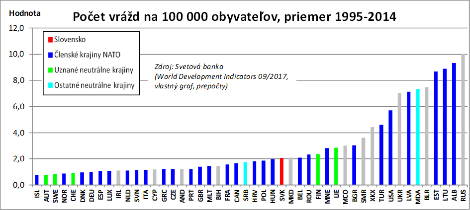 5. Všetky spomenuté krajiny (AUT, SWE, NOR, DNK) patria dlhodobo medzi najbezpečnejšie krajiny v Európe (pozri priložený graf). Patrí tam aj Švajčiarsko (CHE), a to i napriek odporcami kritizovanej skutočnosti, že v súvislosti s domobranou je vo švajčiarskych domácnostiach v súčasnosti až 500 000 najmodernejších plne funkčných útočných pušiek SIG 550, ako i ďalšie zbrane staršej výzbroje patriace vyšším ročníkom mužov.